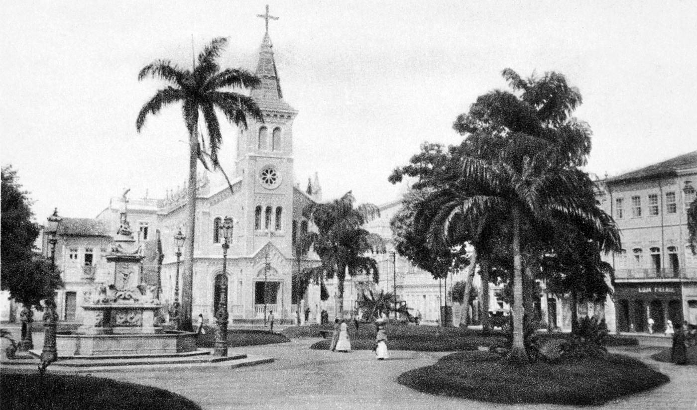 | Cerca de 1900, com destaque exatamente para o lado do edifício do Senado que foi demolido para abertura da Avenida Sete de Setembro. |